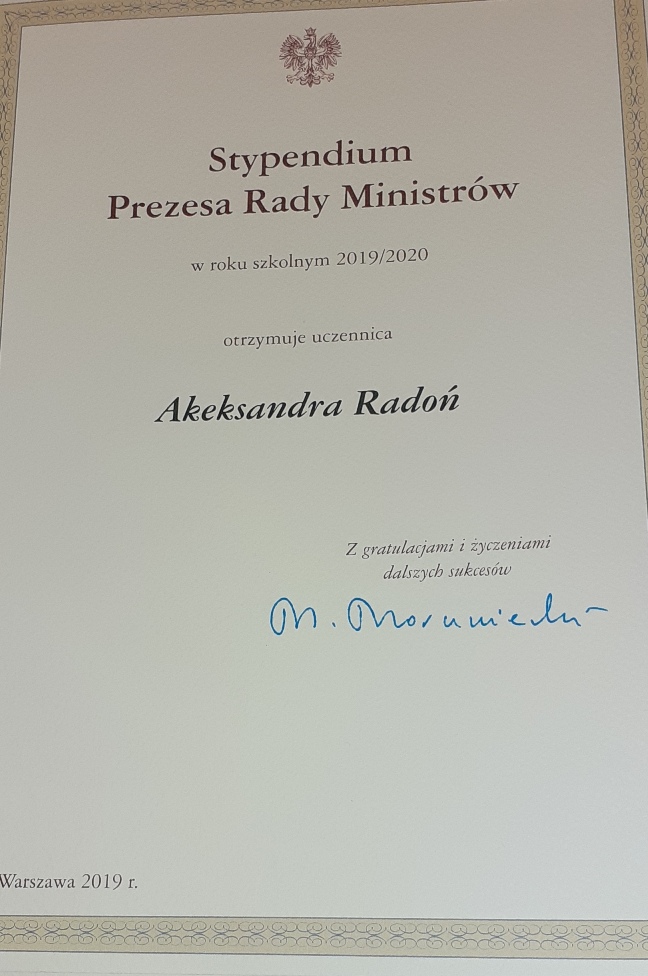 Wśród wyróżnionych tą nagrodą znalazła się uczennica klasy IV Technikum Handlowego, Aleksandra Radoń. Dyplom potwierdzający przyznanie stypendium Ola otrzymała z rąk Małopolskiego Kuratora Oświaty, pani Barbary Nowak.