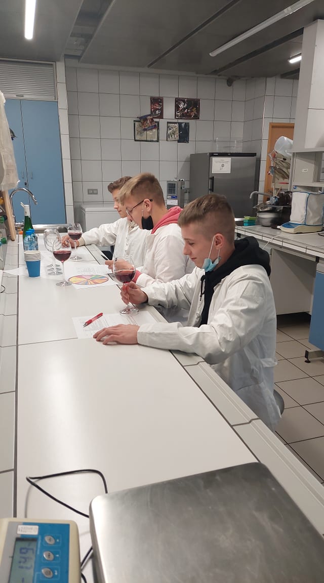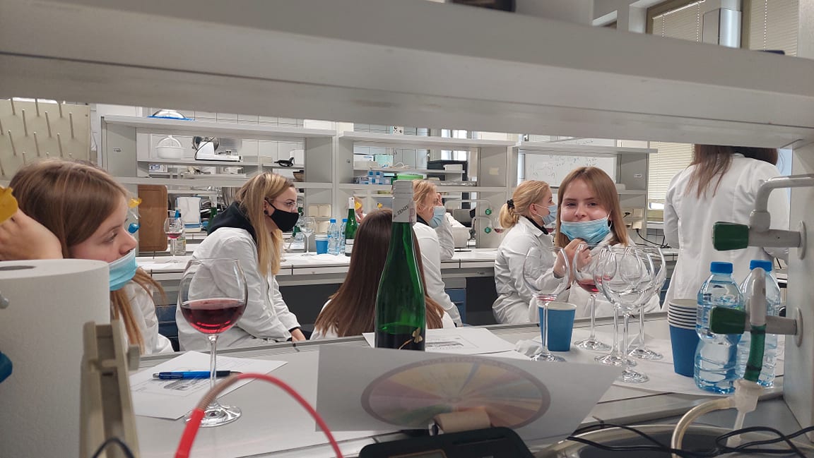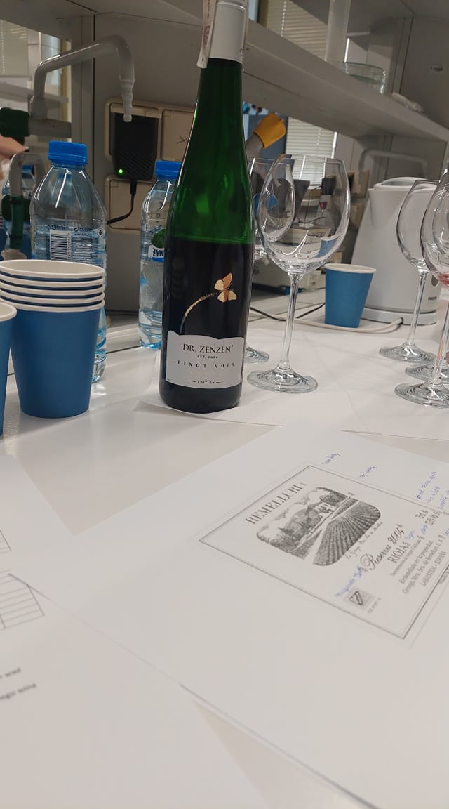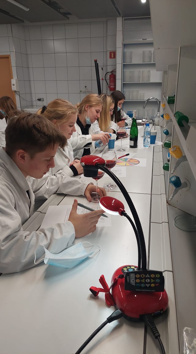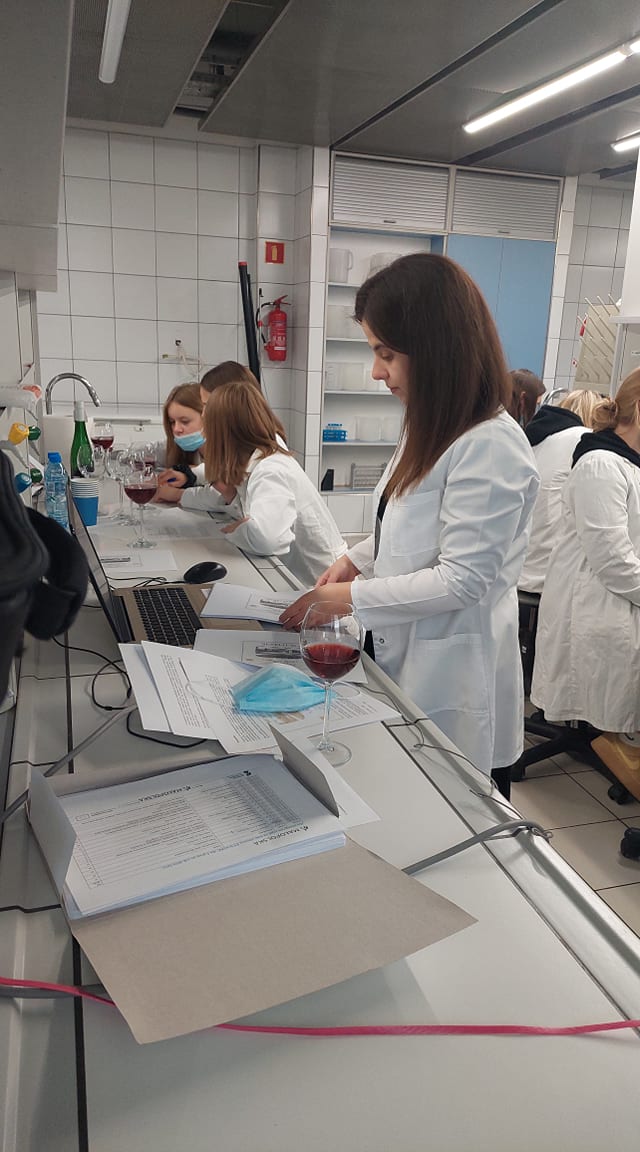 Mieli okazję wraz z prowadzącą zajęcia dr inż. Moniką Cioch- Skoneczny, dokonać oceny organoleptycznej wina pod kątem podstawowych cech sensorycznych takich jak barwa, klarowność, bukiet.