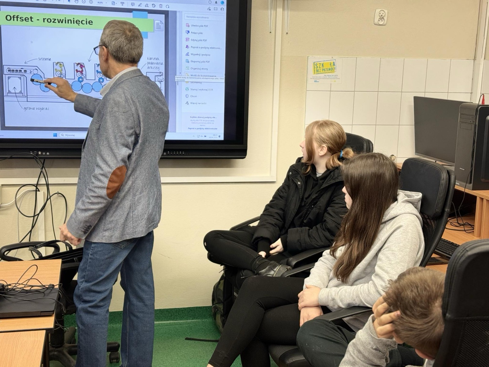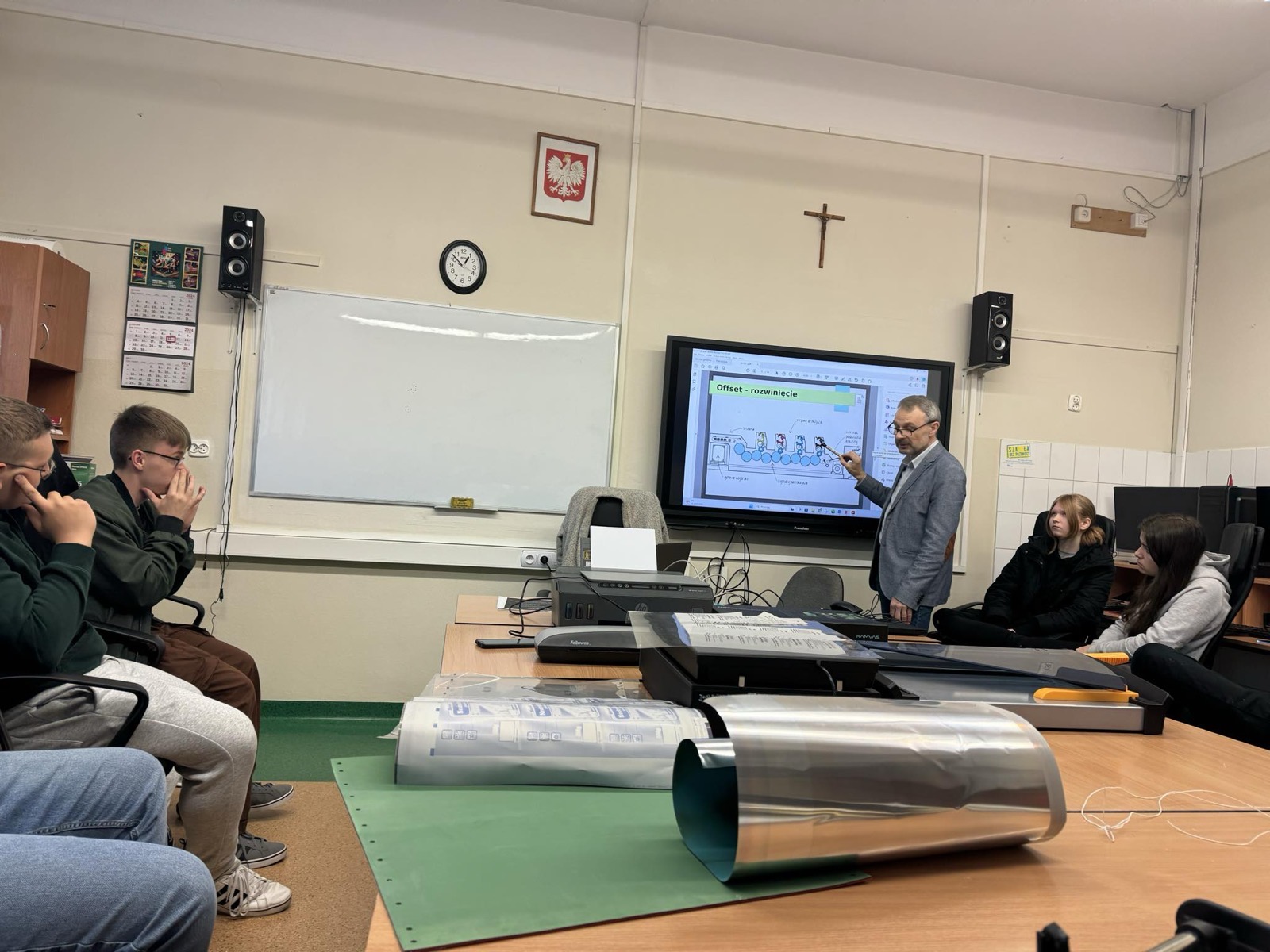 Uczniowie z drugiej klasy technikum o profilu grafiki i poligrafii cyfrowej mieli przyjemność uczestniczyć w interesujących zajęciach, prowadzonych przez właściciela renomowanej firmy poligraficznej #drukarnia4F, Panem Jerzym Arbetusiakiem. Tematem spotkania były fundamentalne zagadnienia z zakresu poligrafii, a uczestnicy zdobyli wiedzę na temat roli i obowiązków drukarza oraz różnych technik drukowania, w tym druków offsetowych. To wartościowe doświadczenie pozwoliło młodzieży lepiej zrozumieć praktyczne aspekty zawodów poligrafa i grafika.