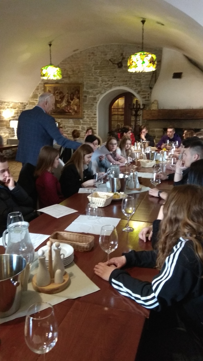 W pierwszej części spotkania uczniowie zapoznali się z zasadami funkcjonowania restauracji i hotelu opartego na zabudowie folwarcznej. Dowiedzieli się jakie są oczekiwania pracodawców zatrudniających pracowników w branży gastronomiczno-hotelarskiej.