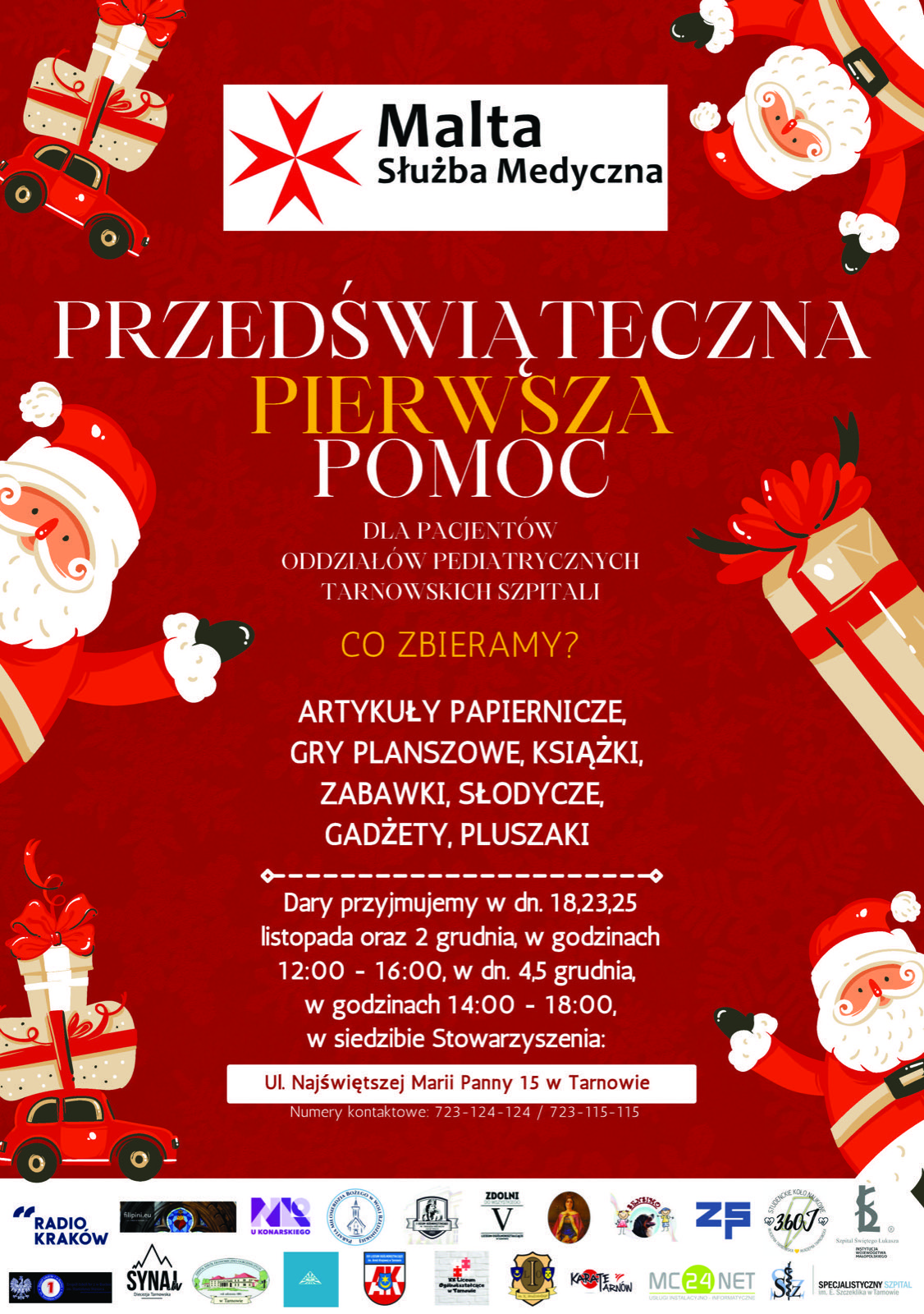 Zachęcamy do udziału w akcji Przedświąteczna Pierwsza Pomoc poprzez zbiórkę prezentów dla dzieci przebywających na oddziałach pediatrycznych tarnowskich szpitali w okresie przedświątecznym. Podarunki można składać do końca listopada do gabinetu pedagoga szkolnego.