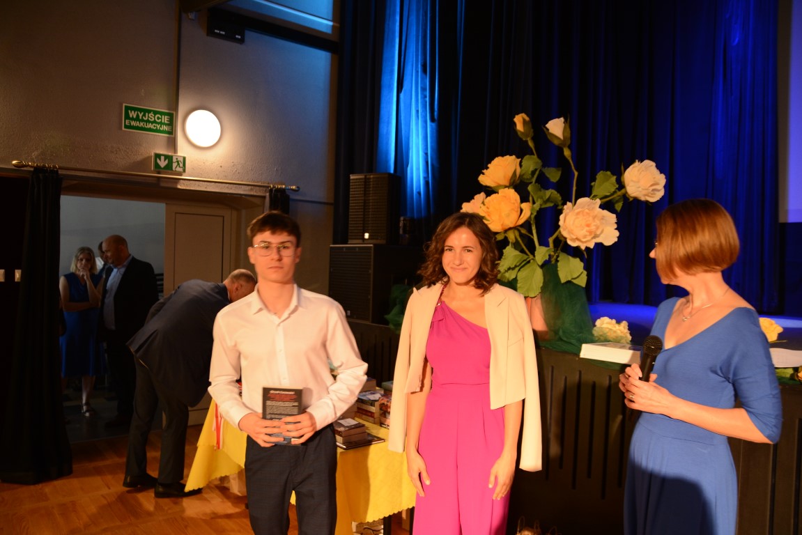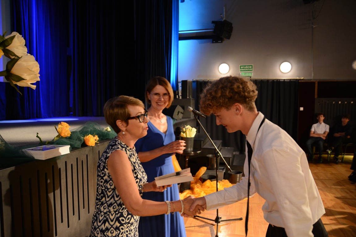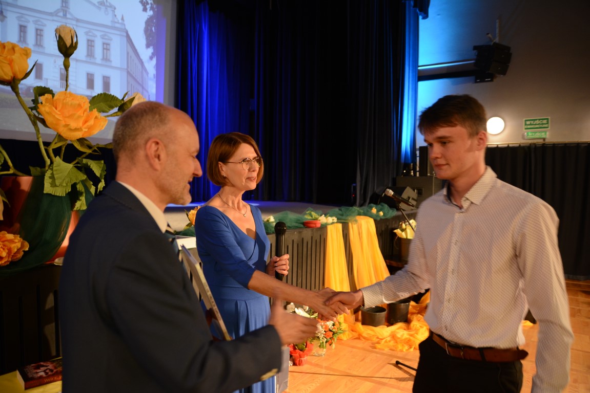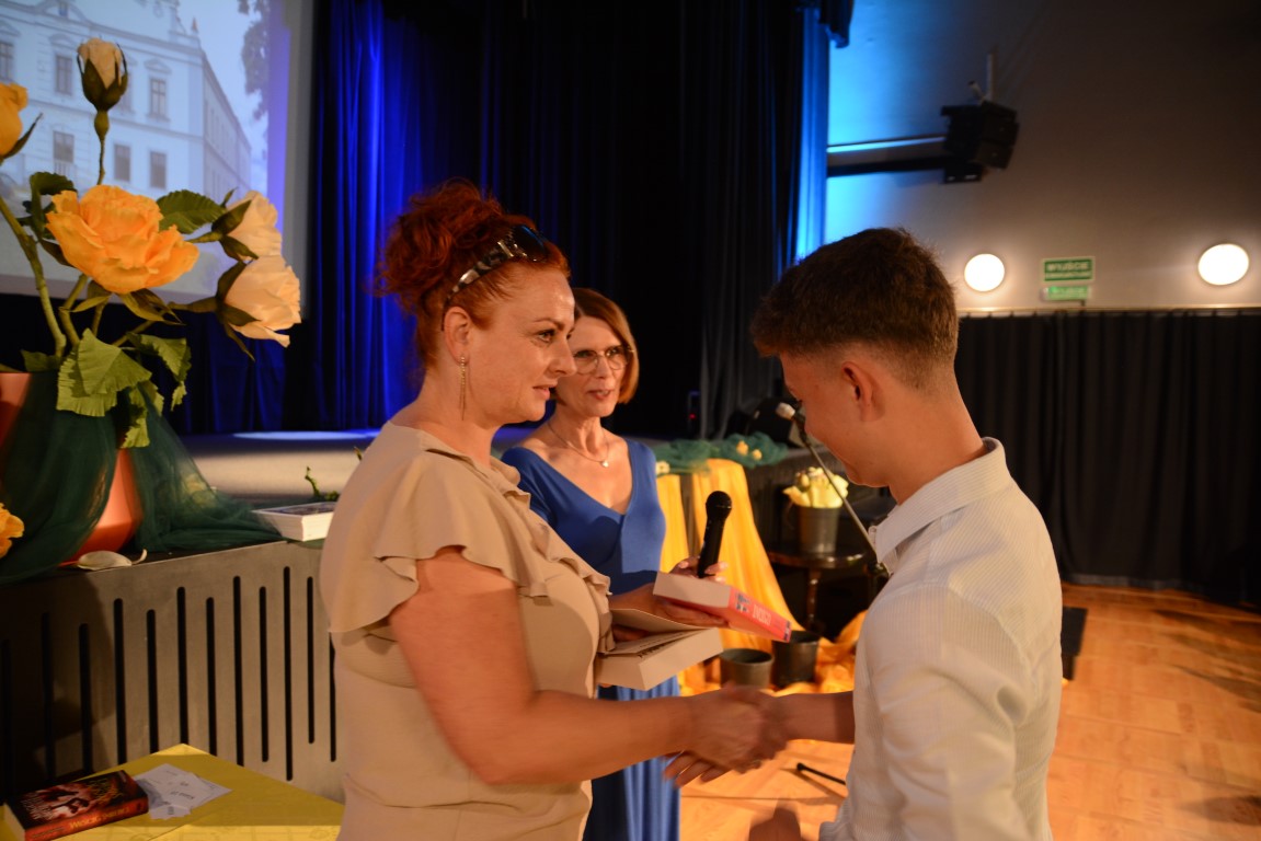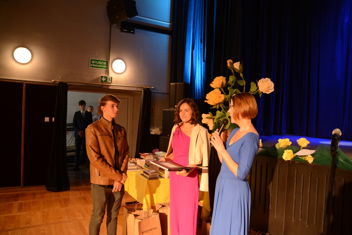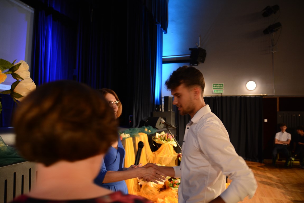 Następnie pani dyrektor wraz z wychowawcami wręczyła nagrody wyróżniającym się w mijającym roku szkolnym uczniom klas Technikum i Szkoły Branżowej oraz ogłosiła, że w bieżącym roku szkolnym kandydatem do stypendium Prezesa Rady Ministrów jest uczeń klasy 4TI Dominik Nowak.