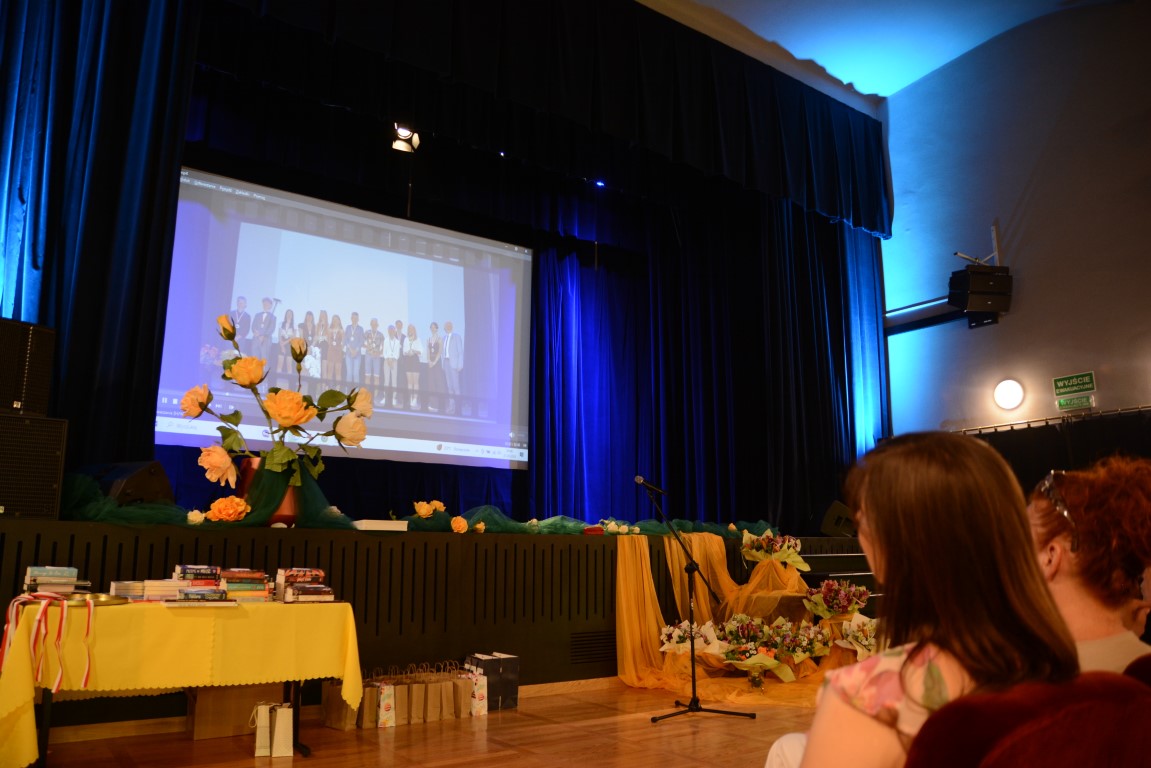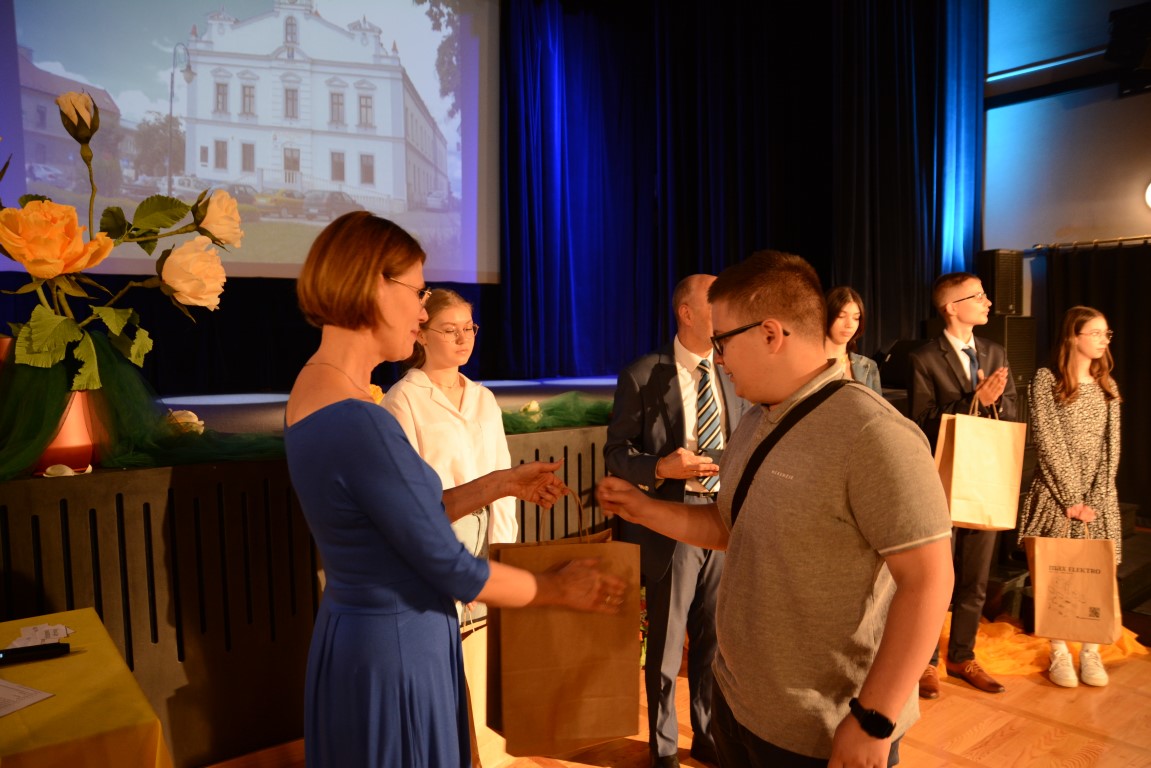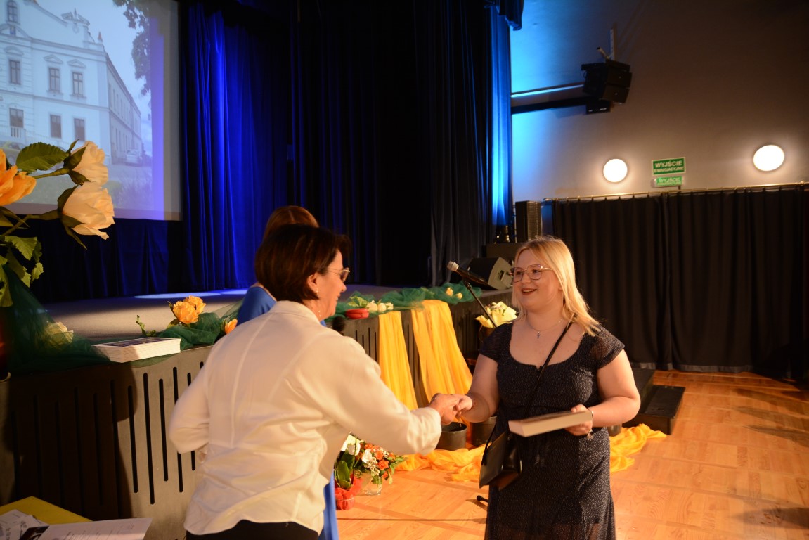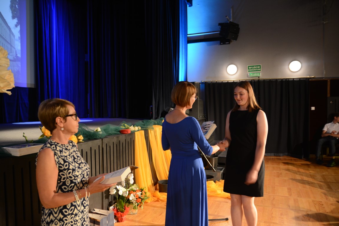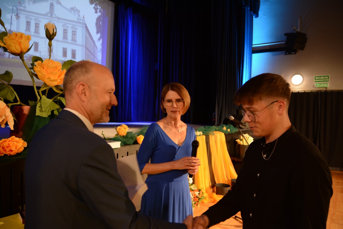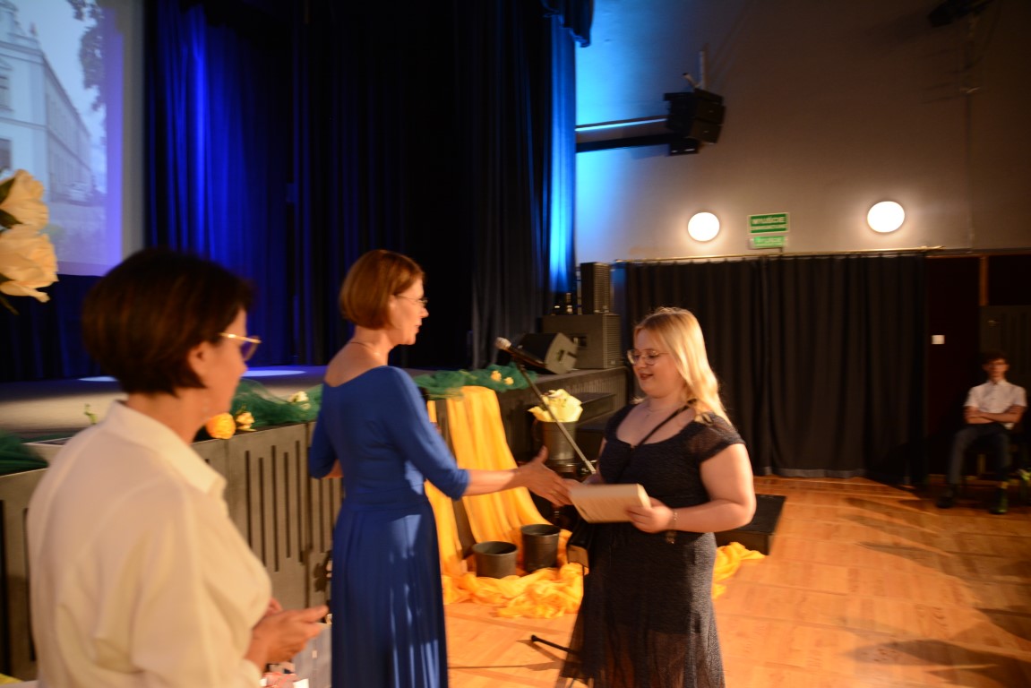 Następnie pani dyrektor wraz z wychowawcami wręczyła nagrody wyróżniającym się w mijającym roku szkolnym uczniom klas Technikum i Szkoły Branżowej oraz ogłosiła, że w bieżącym roku szkolnym kandydatem do stypendium Prezesa Rady Ministrów jest uczeń klasy 4TI Dominik Nowak.
