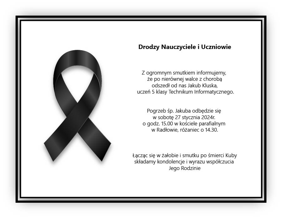 Pragniemy poinformować, że w najbliższą środę tj. 24.01.2024 o godzinie 6:30 w naszym kościele (w Żabnie) odbędzie się Msza Święta w intencji zdrowia naszego drogiego kolegi Kuby z klasy 5THI. Zapraszamy wszystkich, którzy chcieliby go wesprzeć. Niech nasza wspólna modlitwa przyniesie wsparcie Jemu i Rodzinie w tym trudnym czasie.
