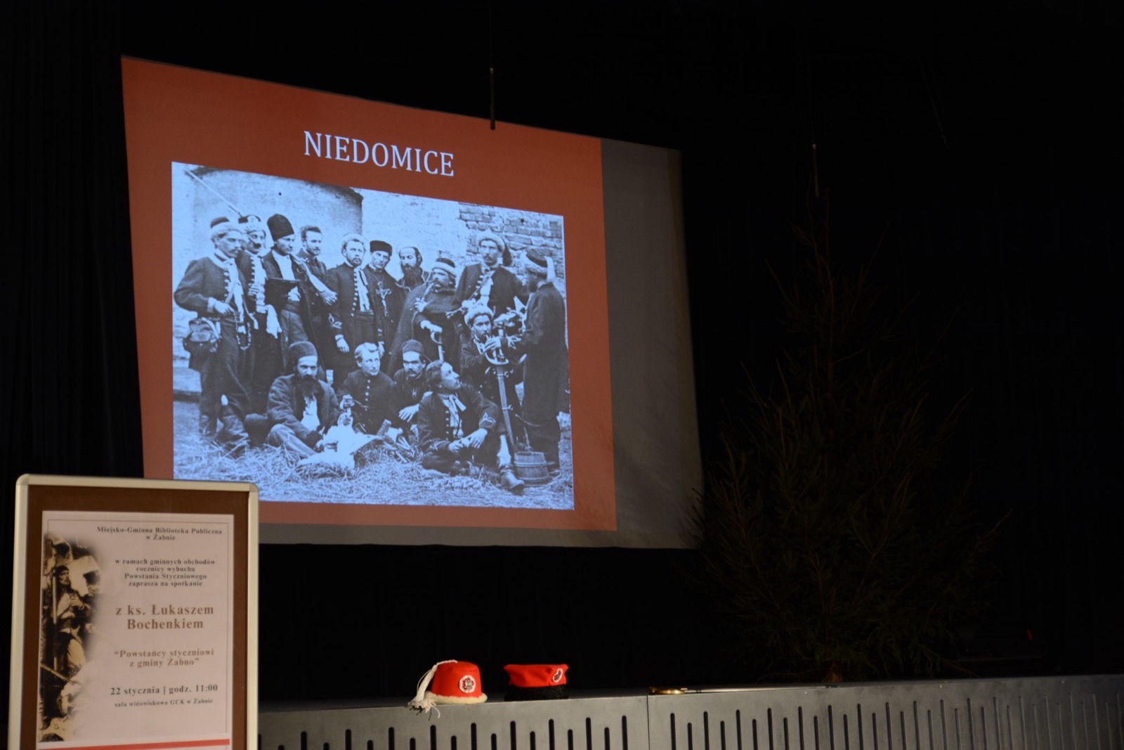 Spotkanie odbyło się w ramach obchodów rocznicy wybuchu Powstania Styczniowego, które rozpoczęło się 22 stycznia 1863 w Królestwie Polskim i 1 lutego 1863 na Litwie a trwało do jesieni 1864 r. Ten najważniejszy zryw narodowowyzwoleńczy swoim zasięgiem objął ziemie zaboru rosyjskiego. Na terenie naszej gminy nie trwały żadne działania powstańcze, natomiast wiele osób angażowało się w pomoc powstańcom oraz ruszyło do walki. Uczestnicy spotkania mogli usłyszeć ciekawie przedstawione opowieści o pochodzących z naszej gminy powstańcach. Opowieści towarzyszył pokaz slajdów z mapami, zdjęciami i ważnymi informacjami dotyczącymi prezentowanych postaci, miejsc i wydarzeń.