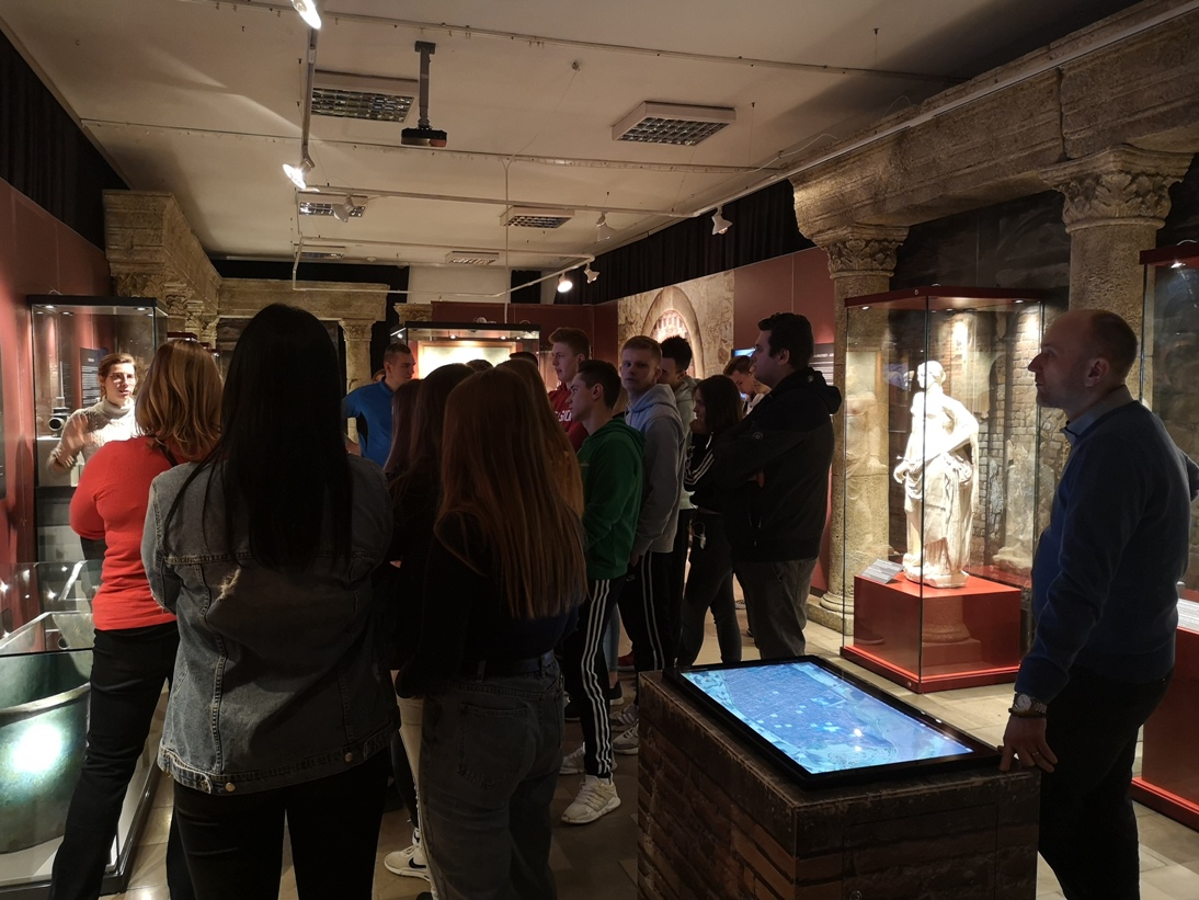 Następnie udali się do Muzeum Archeologicznego na wystawę czasową z Neapolu pt: "Pompeje - życie i śmierć w cieniu Wezuwiusza". Uczniowie klasy drugiej mieli okazję zapoznać się z materiałem wykopaliskowym związanym z największą tragedią z czasów rzymskich-czyli wybuchem wulkanu Wezuwiusz w roku 79 naszej ery. Trujące wyziewy i deszcz wulkaniczny zabiły mieszkańców miasta, którzy nie zdążyli uciec. Miasto w ciągu dwóch dni zostało przykryte 7 metrową warstwą popiołu wulkanicznego. Oficjalne wykopaliska rozpoczęto w 1748 roku. Śmiercionośny popiół stworzył warstwę ochronną, dzięki czemu wszystkie eksponaty są w nienaruszonym stanie. Bezcenne rzeźby i freski, pamiątki będące świadectwem pulsującego życia : kultury i nauki, świata gladiatorów, a przede wszystkim to co codzienne: otoczenie, zwyczaje i przedmioty starożytnych mieszkańców miasta. Poznamy ich również od prywatnej strony, goszcząc w przydomowych ogrodach, ale też we wnętrzach domów publicznych. Poprzez obrazy ruin, nadal zachwycających pięknem, ekspozycja ukazuje również ogrom tragedii i zagłady miasta.