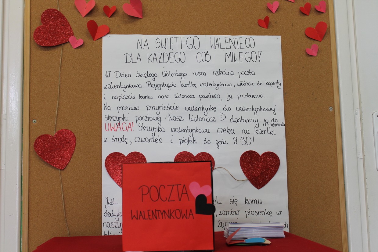 Samorząd Szkolny pod czujnym okiem opiekuna, pani Beaty Król zorganizował pocztę walentynkową. Na szkolnym korytarzu pojawiła się tajemnicza skrzynka z serduszkami. Można było do niej wrzucić walentynkowe kartki i przesłać w ten sposób wyrazy sympatii i przyjaźni. W piątek 14 lutego listonosz wraz z towarzyszącymi mu przedstawicielami Samorządu roznosił miłosną korespondencję adresatom. Walentynkowe kartki niewątpliwie sprawiły dużą radość obdarowanym.