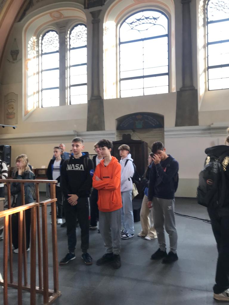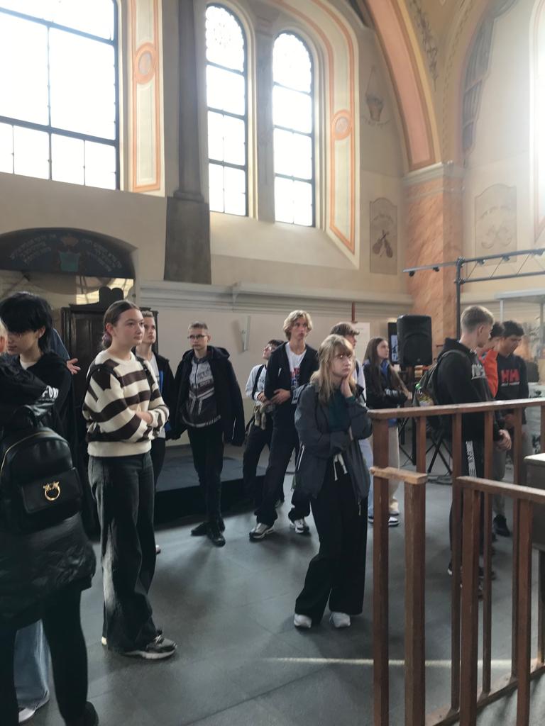 Pierwszym punktem wycieczki była wizyta w Ośrodku Spotkania Kultur czyli dawnej dąbrowskiej synagodze. Historię żydowskiego domu modlitwy , jego bogatą symbolikę i ornamentykę oraz dzieje dąbrowskich Żydów w interesującej opowieści przybliżył młodzieży dyrektor Dąbrowskiego Domu Kultury mgr Paweł Chojnowski. Uczniowie mieli też okazję obejrzeć wystawę “Radio Nostalgia” prezentującą radioodbiorniki z lat dwudziestych i trzydziestych XX w. oraz polskie odbiorniki radiowe z lat 1946-66 z kolekcji Ks. Ryszarda Piaseckiego.