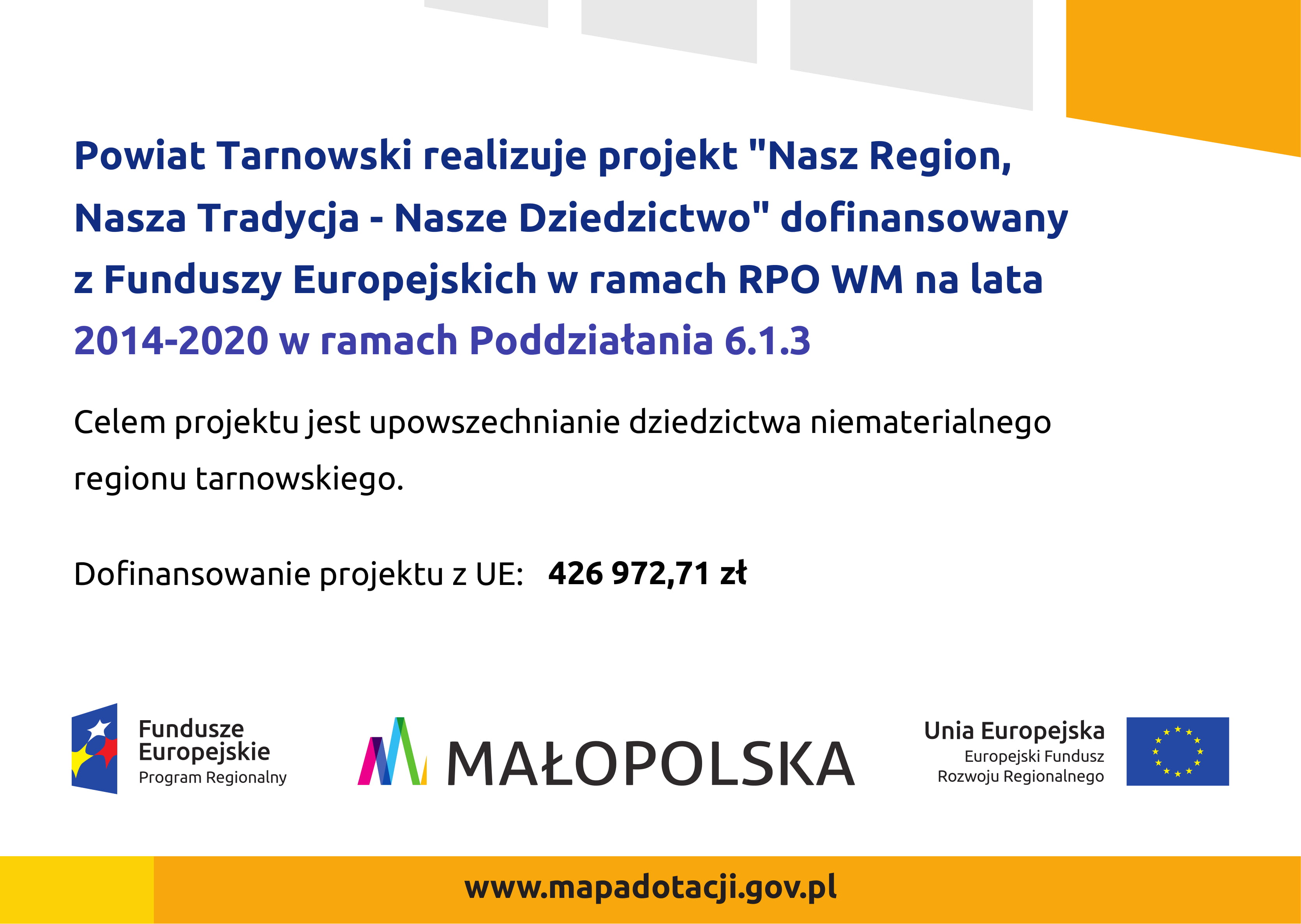 REGULAMIN REKRUTACJI do udziału w warsztatach realizowanych w ramach projektu pn. "Nasz Region, Nasza Tradycja - Nasze Dziedzictwo" współfinansowanego ze środków Funduszy Europejskich w ramach Regionalnego Programu Operacyjnego Województwa Małopolskiego na lata 2014-2020 Oś nr VI Dziedzictwo regionalne, Działanie 6.1 Rozwój dziedzictwa kulturowego i naturalnego, Poddziałanie 6.1.3 Rozwój instytucji kultury oraz udostępnianie dziedzictwa kulturowego. Beneficjent i Realizator Projektu: Powiat Tarnowski Termin realizacji Projektu: 1 maj 2017 do 31 grudnia 2019 r.