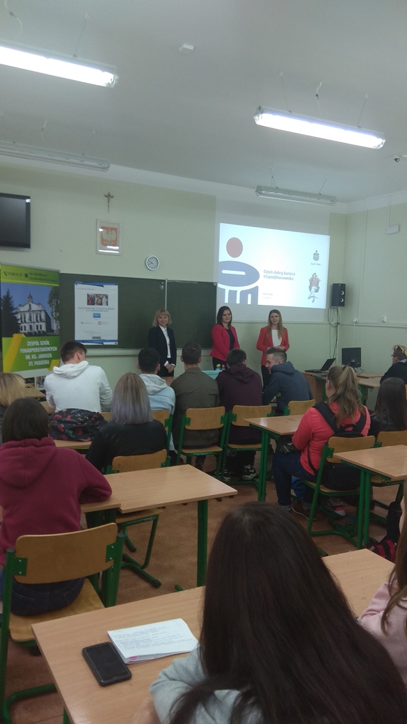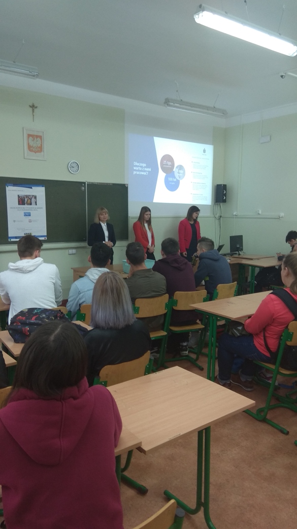 23 października 2019 r. uczniowie klas 3 TEH, 4 TH oraz 3 THI wzięli udział w spotkaniu z przedstawicielami Banku PKO Bank Polski w Tarnowie i Krakowie. Naszymi gośćmi były: Pani Magdalena Pabian – kierownik zespołu obsługi klienta oraz Pani Marlena Kozioł i Barbara Bryndal - specjalistki ds. HR i obsługi partnera biznesowego. Tematyka spotkania dotyczyła działalności placówki oraz możliwości zatrudnienia w banku absolwentów naszej szkoły. Młodzież uzyskała informacje dotyczące oferty produktów bankowych, wymagań stawianych potencjalnym pracownikom oraz zasad rekrutacji. Panie zaprezentowały aplikację ,,Bot rekrutuje! Praca w banku”, dzięki której bez wychodzenia z domu można rozpocząć rozmowę kwalifikacyjną. Panie podkreśliły również istotę zdolności komunikacyjnych i interpersonalnych oraz sumienności w wykonywaniu powierzonych zadań. Pani kierownik zwróciła uwagę, że praca w banku stwarza możliwość rozwoju osobistego i zawodowego, zapewnia stabilne i atrakcyjne warunki zatrudnienia. Uczniowie otrzymali wiele wskazówek niezbędnych dla młodych ludzi wchodzących na rynek pracy.